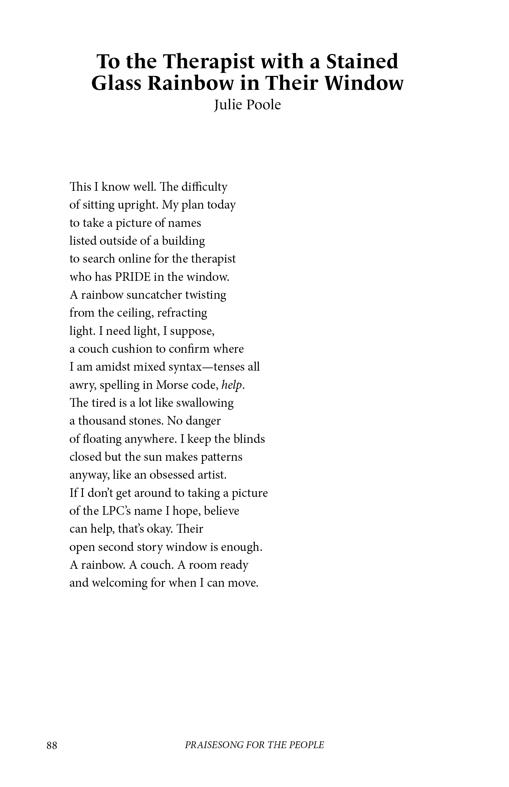 Here is my praisesong to Amanda Johnston’s expansive vision and to this resonant collection of voices and their praises to the everyday people of this big, troubling, diverse, and dynamic state we call home. — Carrie Fountain, author of The Poem Forest