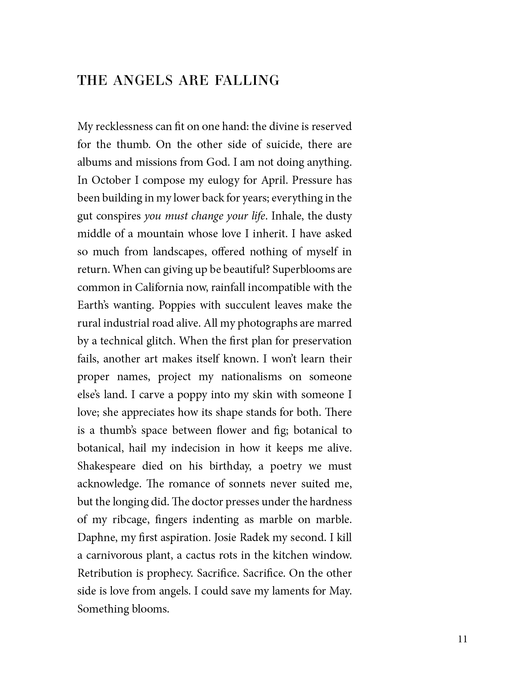 Building glass structures from her questions, Farah pushes their architecture almost to breaking. Then breaking, the spirit—luminous, actualized—reveals itself through the cracks. Through the landscapes of California, Palestine, and all of the distances in between, there emerges a new sense of devotion to what is possible which might thrust us, together, “off the edge, / in love, towards God.”